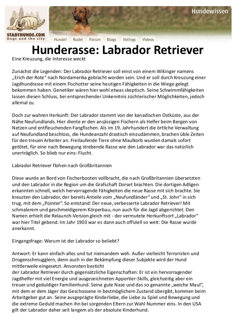 Der Labrador ist eine mittelgroße Hunderasse die aus Großbritannien stammt und zur Gruppe der. Der eigentliche Siegeszug des Labrador Retrievers nahm jedoch erst in Europa so richtig Fahrt auf. Steckbrief Labrador Retriever Der Labrador Retriever ist eine Hunderasse die in Großbritannien gezüchtet wurde.