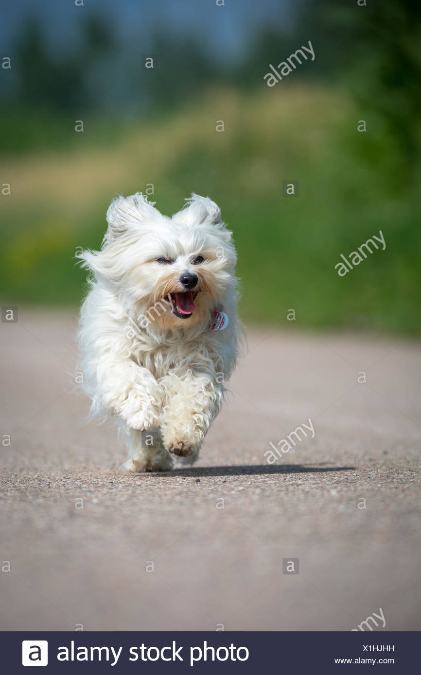 Ein Kleiner Weisser Hund Mit Langem Fell Rennt Uber Eine Strasse Stock Photo Alamy